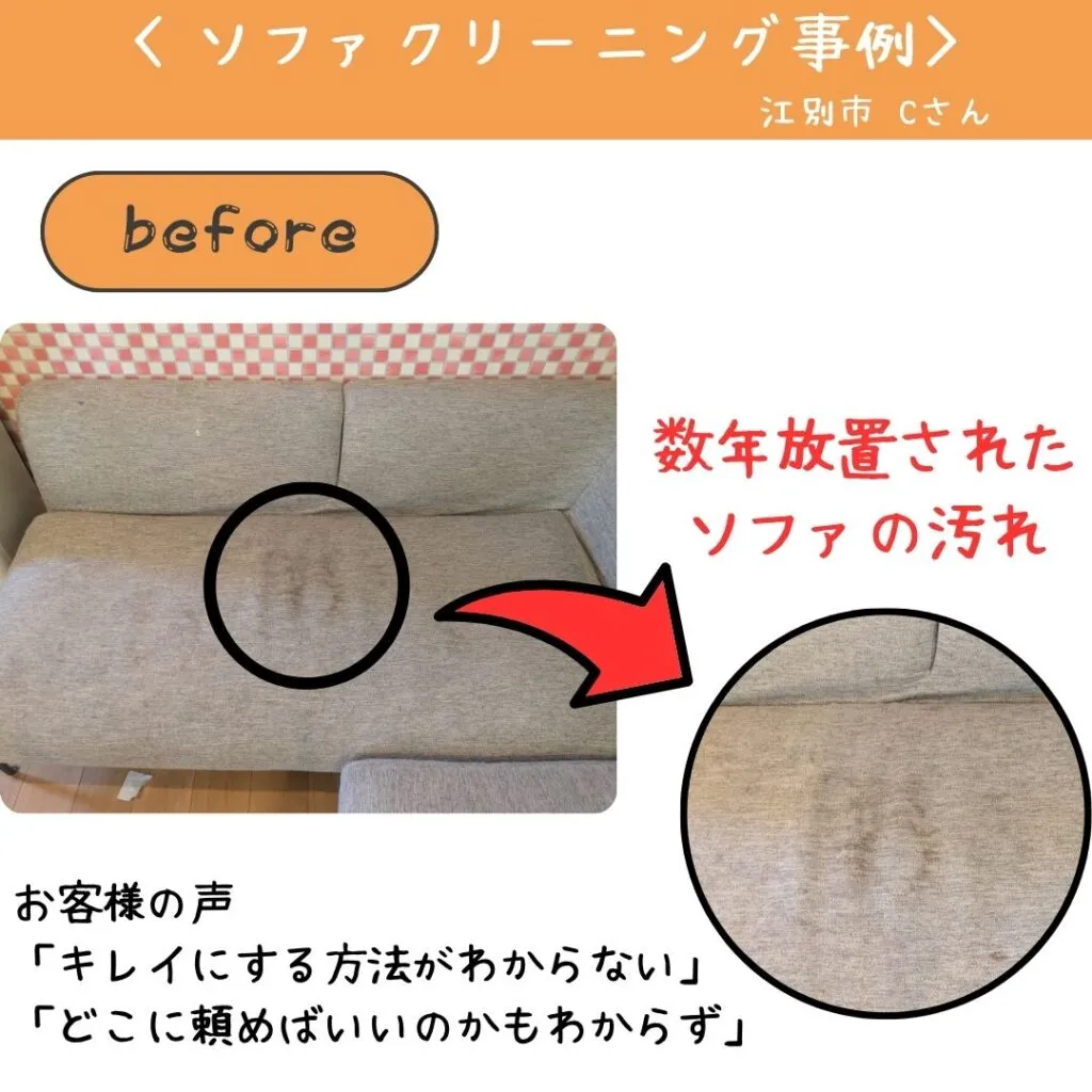 汚れの洗い方がわからず、そもそもソファクリーニングというサービスの存在もご存じなかったため、何年もそのまま放置されていたそうです。