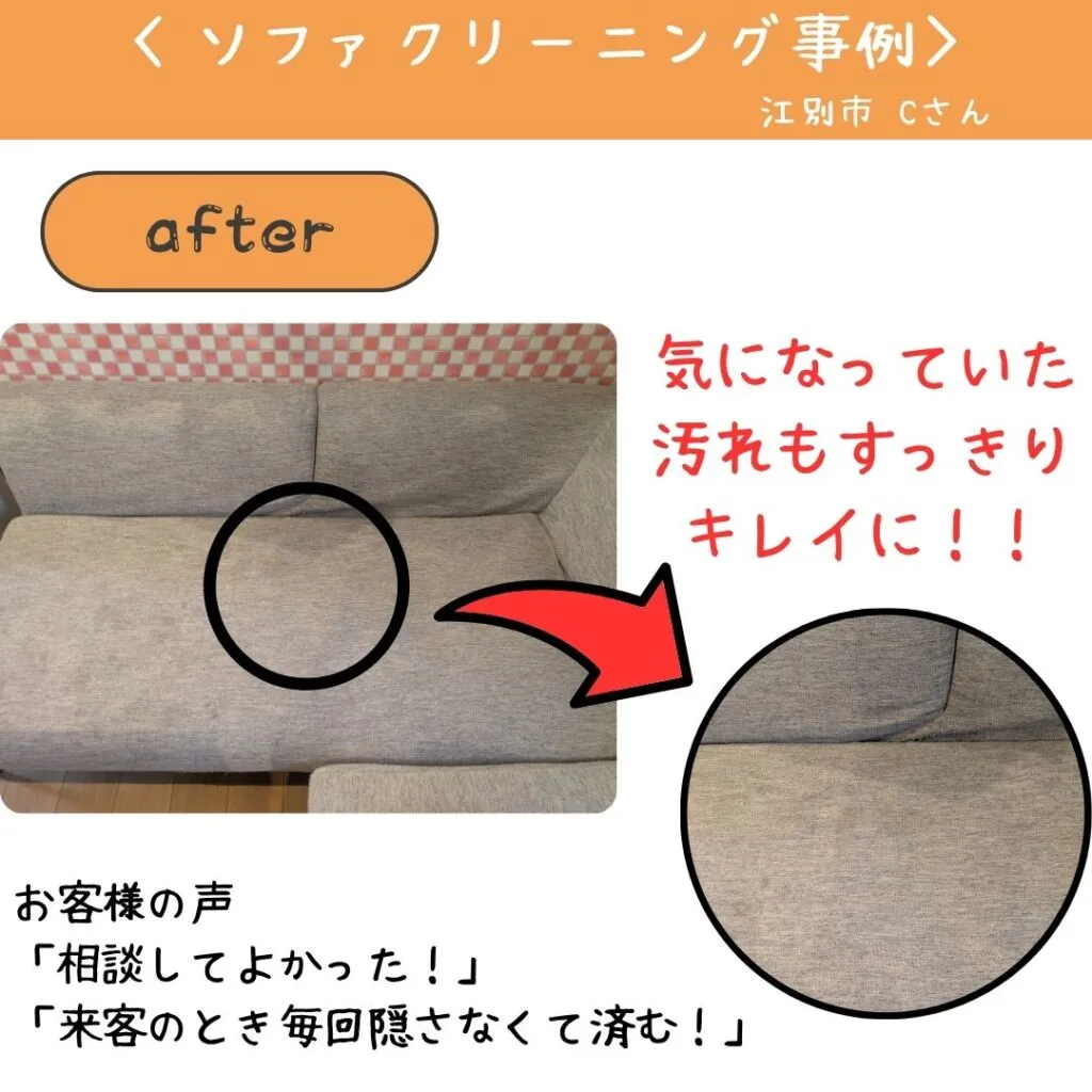 そんなお悩みのソファがすっかりキレイになり、作業後に曇りのない笑顔で喜でくださった姿がとても印象的で、私たちを嬉しい気持ちになりました!