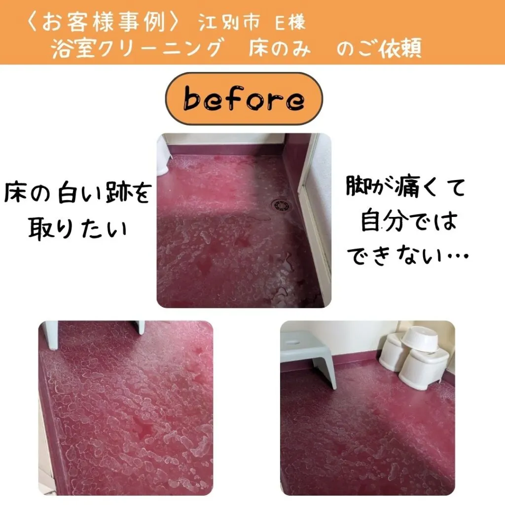 「浴室の床の白い汚れが気になって…脚が痛くてしゃがめないから代わりに擦ってほしいの」