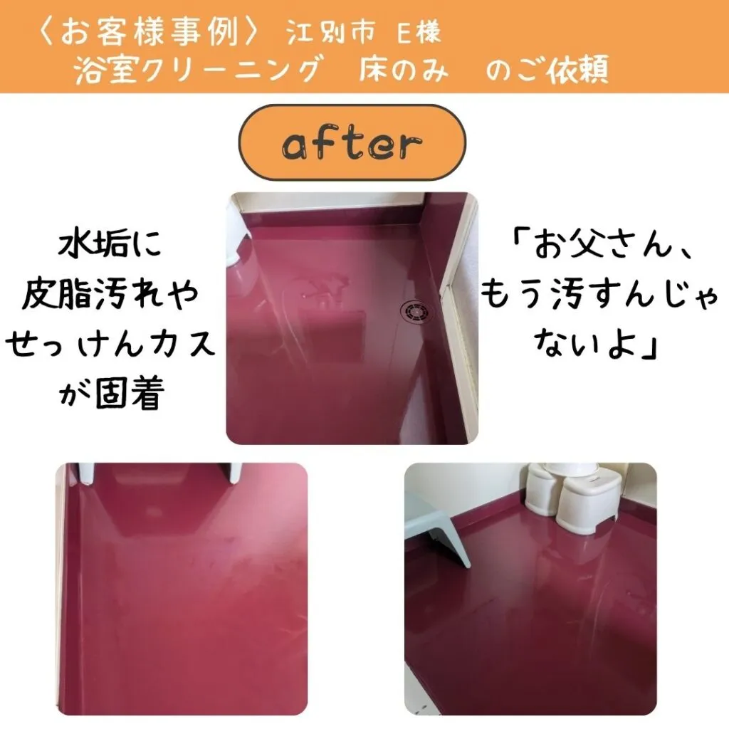 水垢やせっけんカス、皮脂汚れなどの汚れが固まりになっているので、家庭用の洗剤で擦るだけでは落ちないですし、強くこすることで床材を傷つける可能性もあることをお客様にお伝えし、専用の薬剤を使用したハウスクリーニングを行うことになりました。